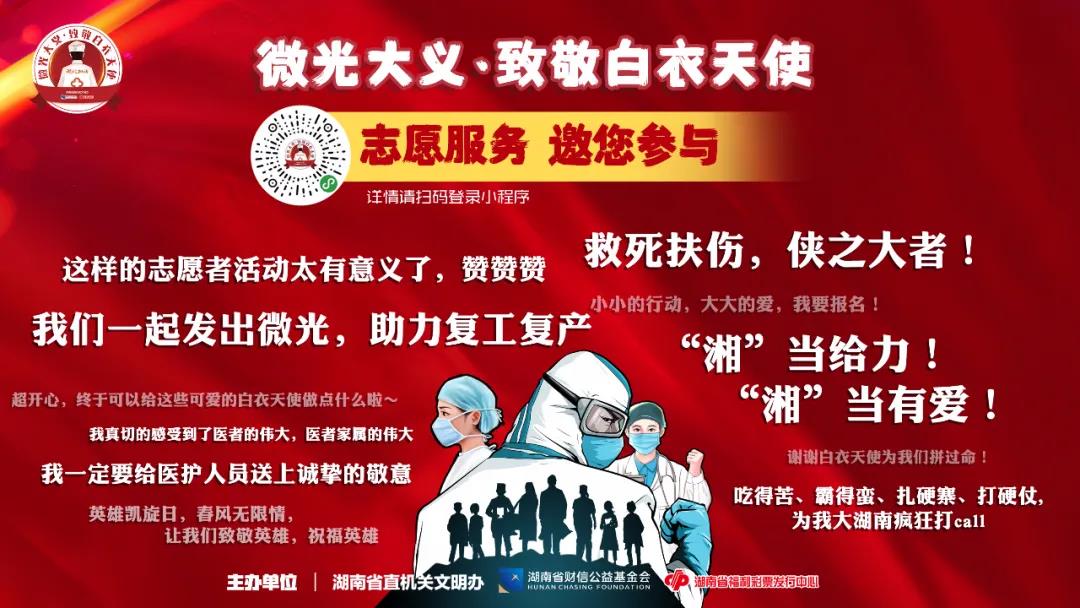 据悉,“微光大义•致敬白衣天使”活动自3月初启动以来,将对湖南援鄂的1498名医务人员送去价值180万元的慰问物品,并鼓励志愿者与医务人员家属建立联系,开展持续服务。活动主办方邀请省直单位志愿者和社会爱心市民报名参与,用实际行动向“最美逆行者”表达一份心意,致以由衷敬意。